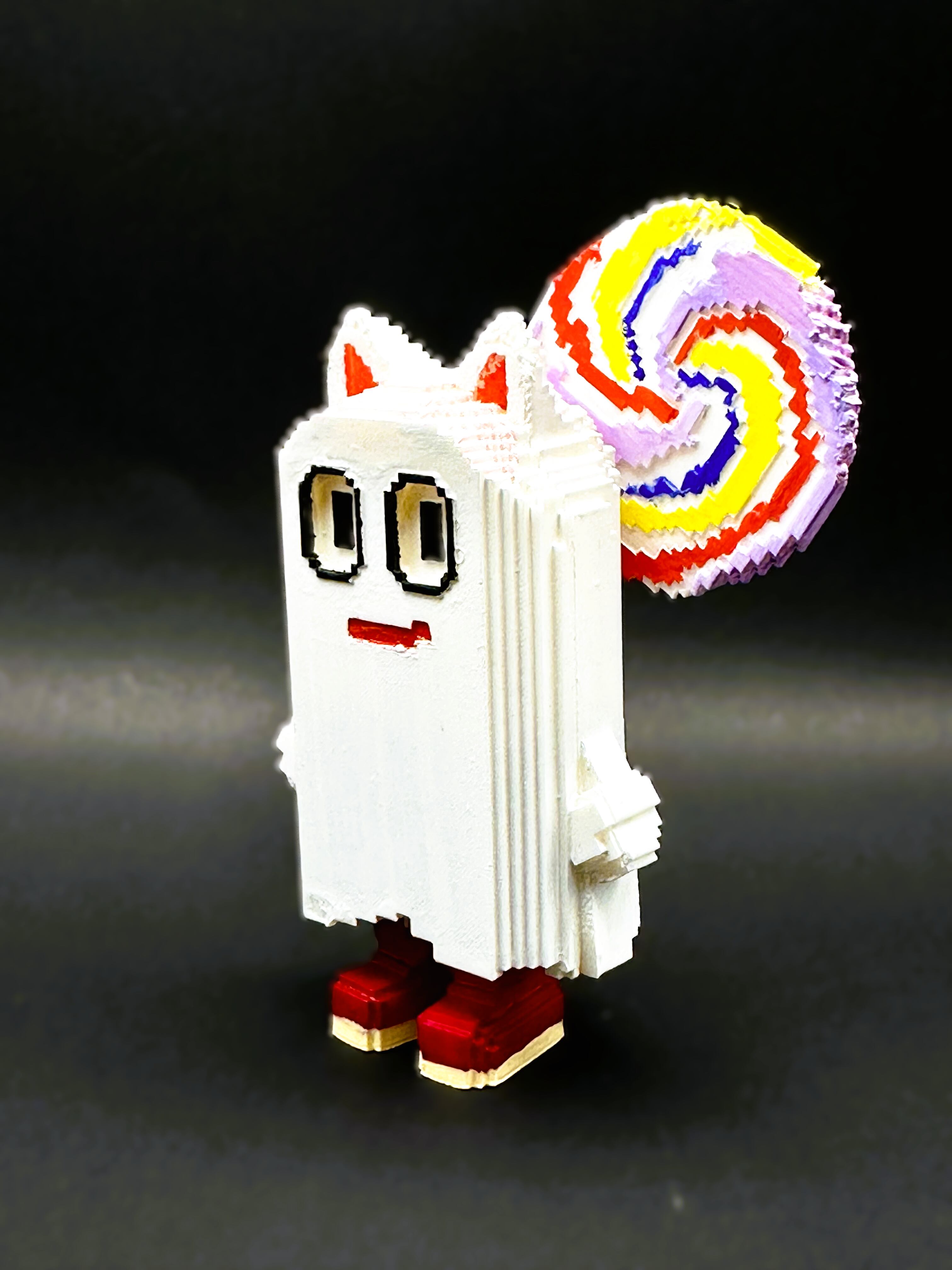 シーツを被った子供のような風貌、巨大なペロペロキャンディーを背負ったキュートな『ルンルンバオランタン』は3Dプリンターで出力し、手作業で塗装を施した特別な一品です。